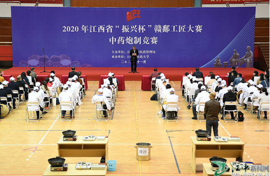为贯彻落实党的十九大提出的“建设知识型、技能型、创新型劳动者大军,弘扬劳模精神和工匠精神”,推动全省高技能人才队伍建设,促进中医药事业传承创新发展,提高中医药服务能力水平,11月21日至22日,2020年江西省“振兴杯”赣鄱工匠大赛中药炮制竞赛在学校体育馆举行。来自全省多家中医药企事业单位及部分中高等医药院校74人组成的20支代表队参赛。