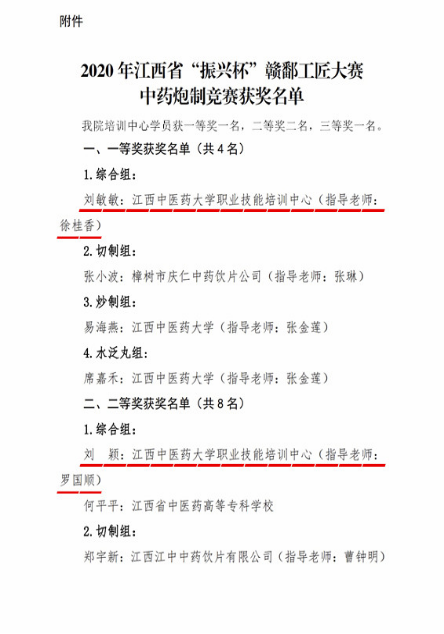 我院培训中心2020年秋季中药炮制培训班4名学员分获4个奖项:刘敏敏获综合组一等奖,刘颖获综合组二等奖,谢亚婷获切制组二等奖,张涛获炒制组三等奖。