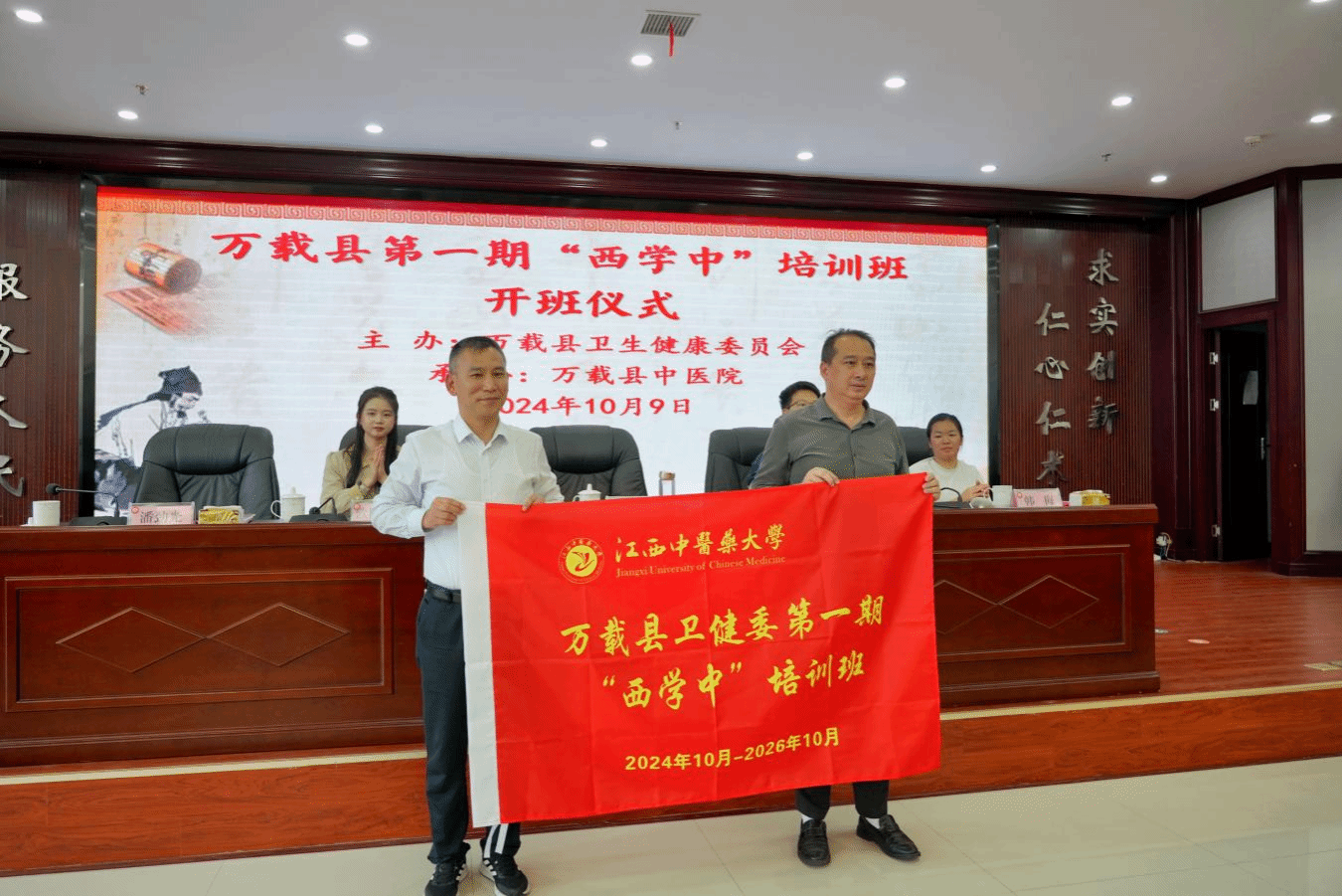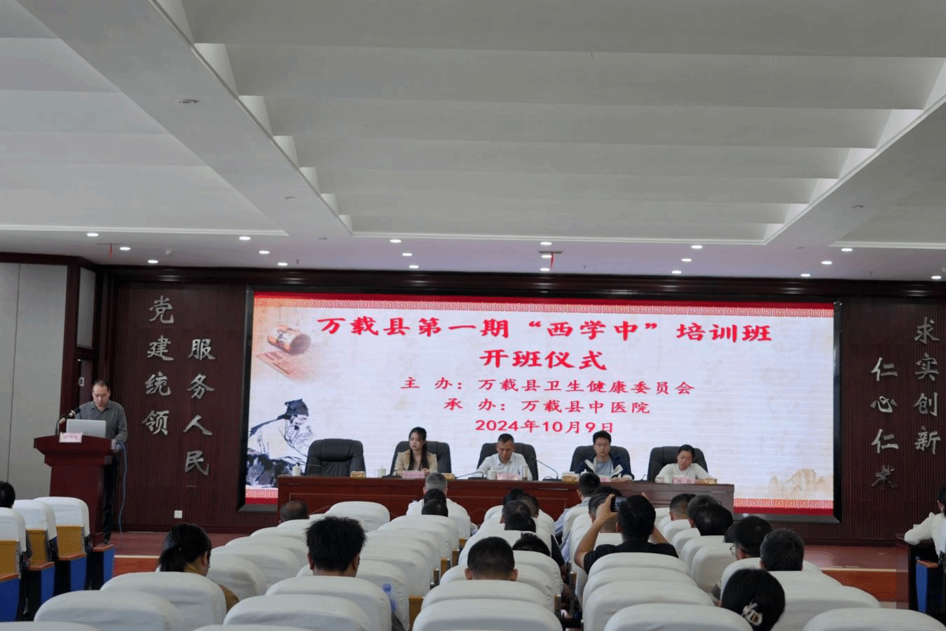 10月9日下午,万载县第一期“西学中”培训班在万载县中医院开班。华亿平台(培训学院)副院长罗国顺,万载县卫健委党委委员韩梅,万载县中医院党委书记潘劲光出席开班仪式并讲话。万载县中医院党委委员、副院长易文彪主持仪式。万载县中医院副院长周武云作为学员代表发言。万载县中医院领导班子,华亿平台(培训学院)培训部相关成员及万载县卫健系统81名非中医类别医师学员参加活动。