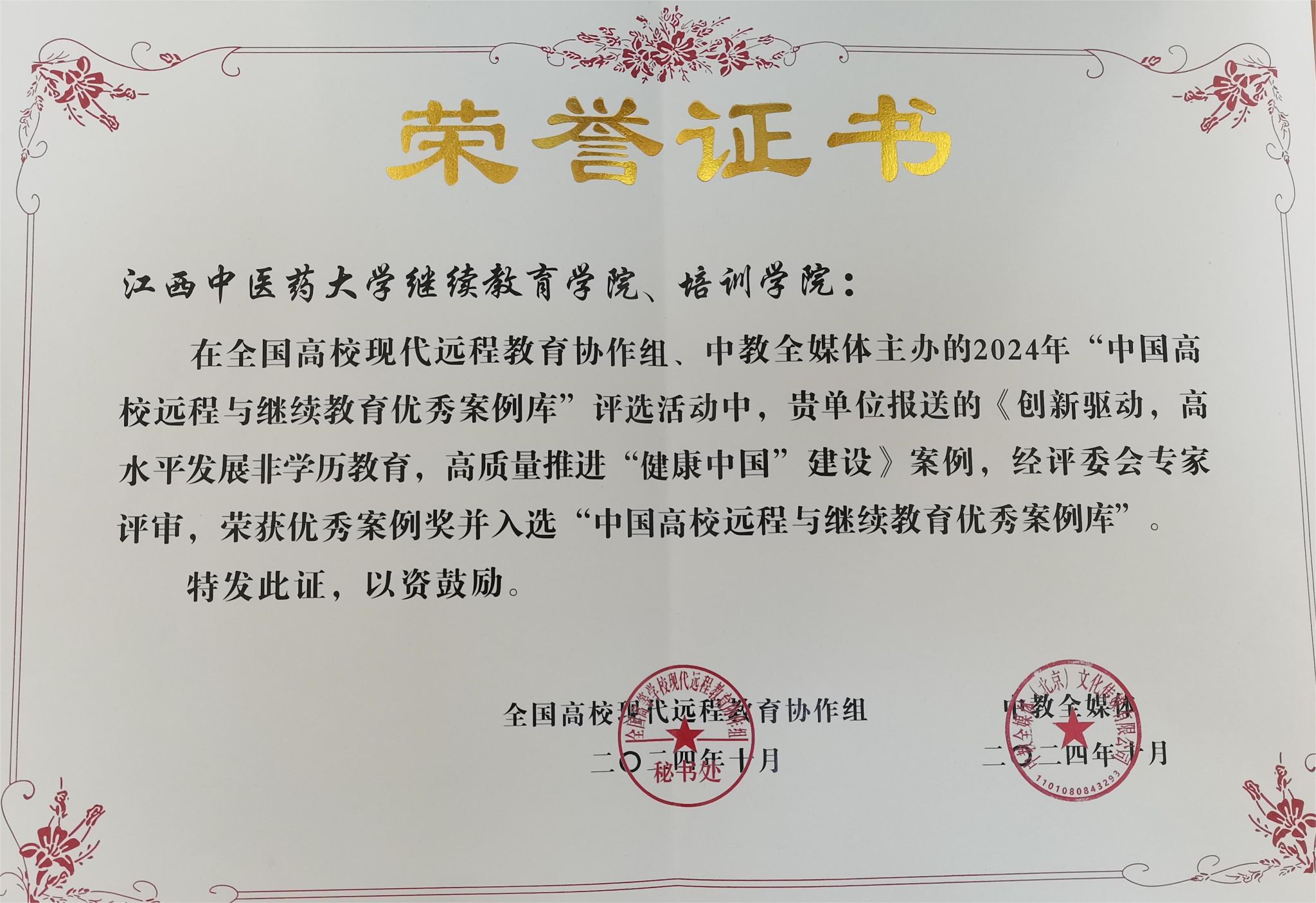 为更好推动我国网络与继续教育事业的蓬勃发展,发挥优秀榜样作用和影响力,推广远程与继续教育典型经验和案例,大会开幕式上隆重举行了“2024中国高校远程与继续教育优秀案例库评选活动”颁奖典礼。我院报送的《创新驱动,高水平发展非学历教育,高质量推进“健康中国”建设》案例,荣获“2024中国高校远程与继续教育优秀案例”称号,并入选“中国高校远程与继续教育优秀案例库”,我院是本届大会全国中医药院校唯一获此殊荣单位,也是江西省高校唯一获此殊荣单位。