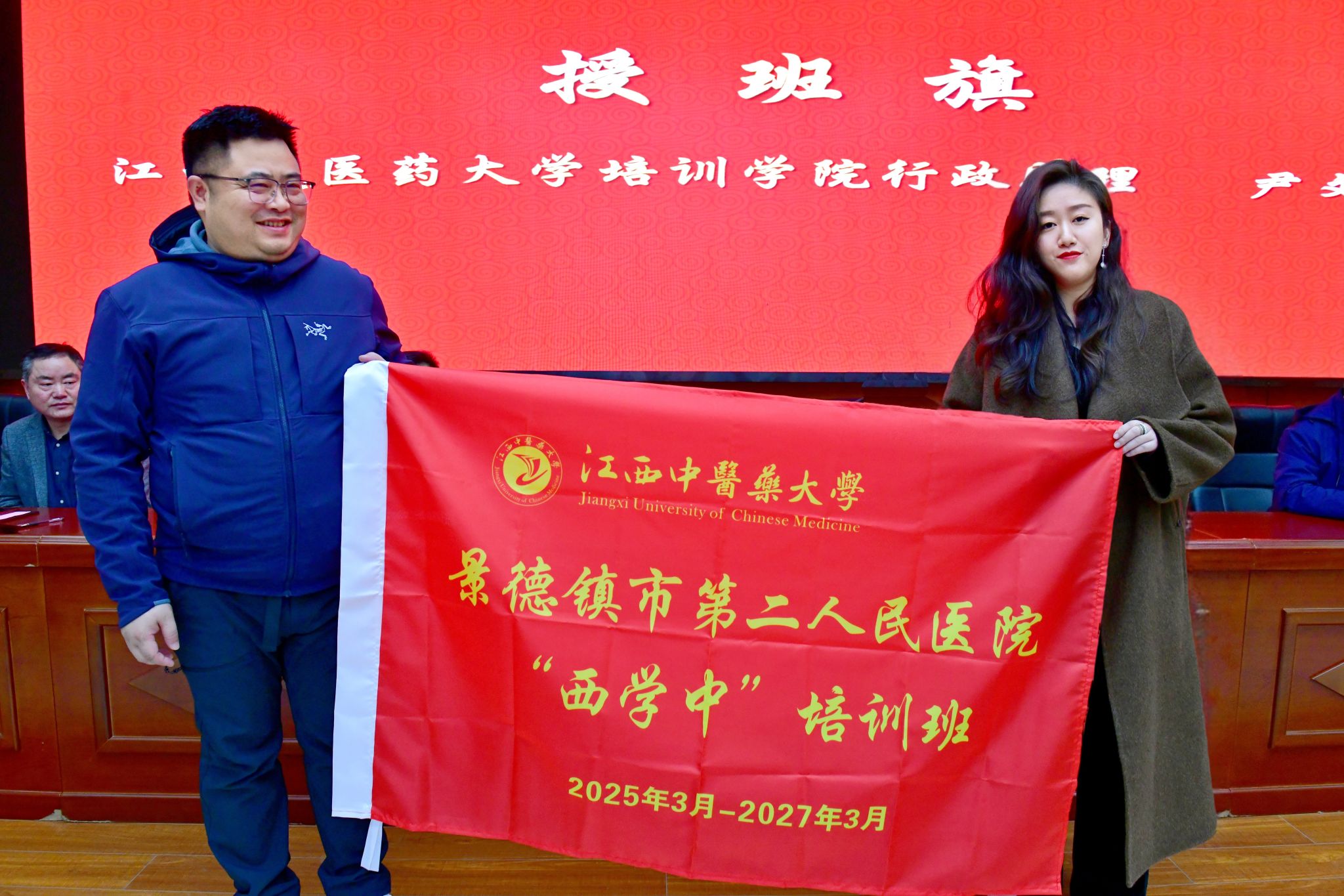 “西学中”培训项目负责人尹文琦向培训班负责人刘奇授班旗。