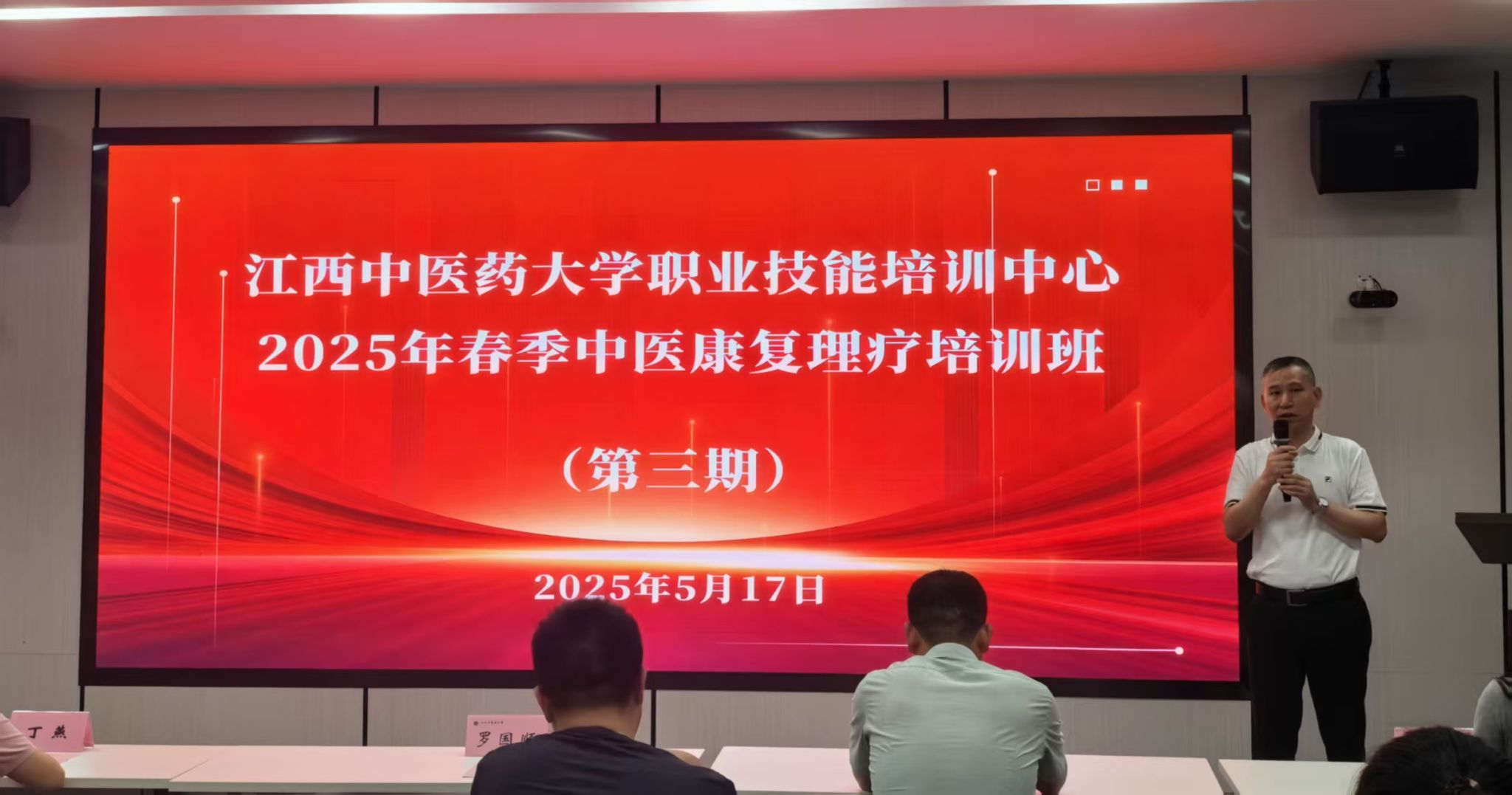 近日,2025年春季中医康复理疗培训班(第三期)在阳明校区开班。华亿平台(培训学院)副院长罗国顺出席开班仪式并对学员提出了相关培训要求和目标。学院鉴定部负责人主持活动,培训部项目负责人及36名学员参加了仪式。